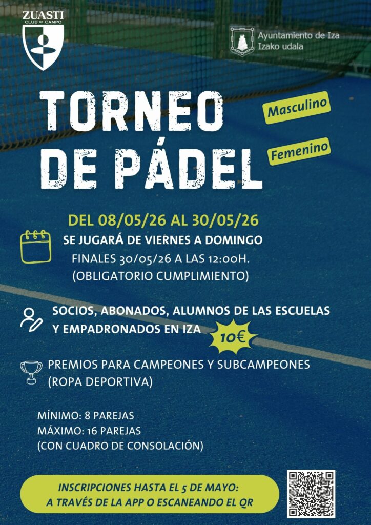 Llega el Torneo de Pádel por parejas, la cita deportiva clave de esta primavera. Este evento nace con el objetivo de reunir a socios, abonados, alumnos y empadronados en Iza en una competición que combina la técnica, el esfuerzo y el buen ambiente en pista. Es la ocasión ideal para disfrutar de la competición y de este deporte en Zuasti.