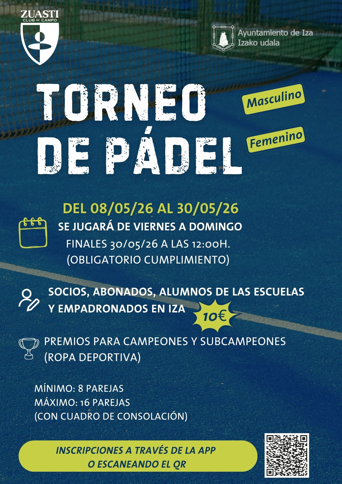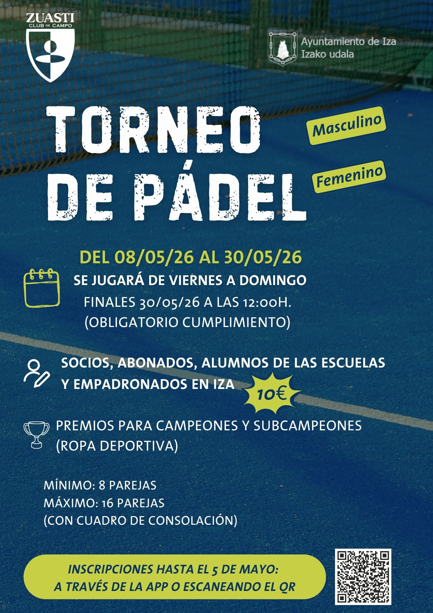 ⚠️ Nota importante: Las finales de ambas categorías (masculina y femenina) se disputarán el sábado 30 de mayo a las 12:00h. Esta fecha es de obligatorio cumplimiento para todos los participantes.